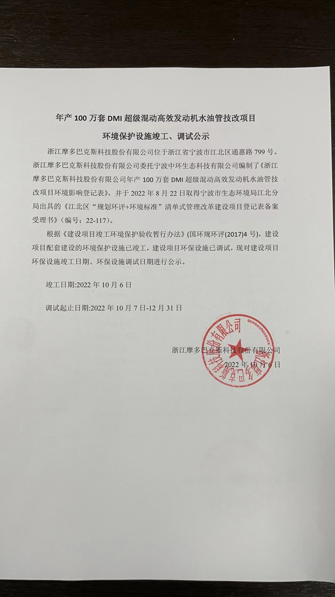 年產100萬套DMI超級混動高效發動機水油管技改項目環保設施竣工、調試公示
