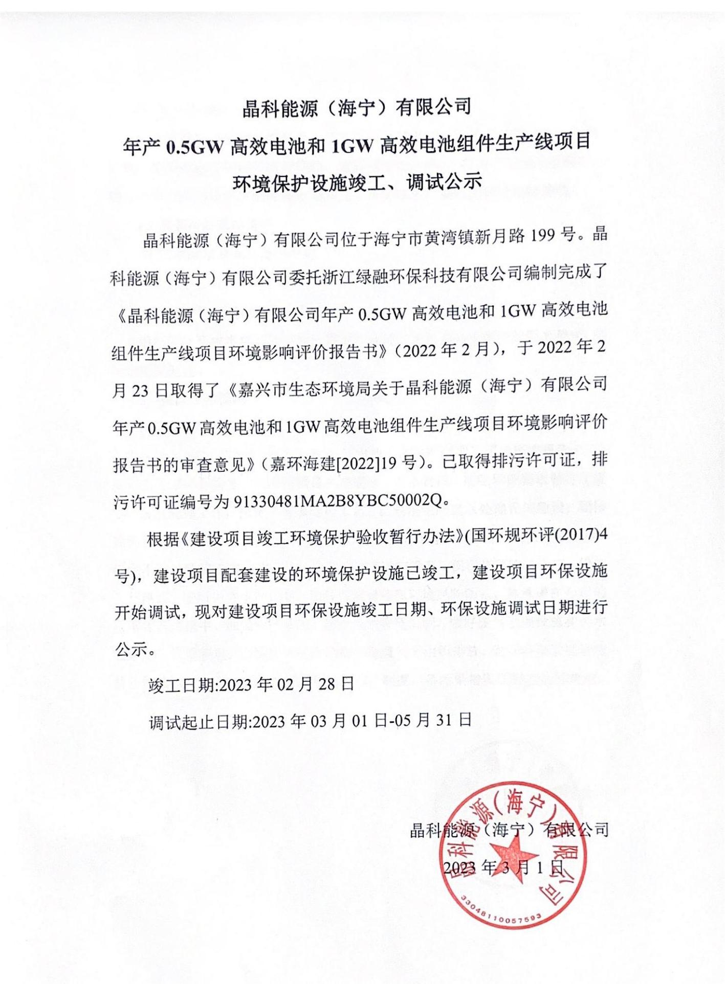 晶科能源(海寧)有限公司年產0.5GW高效電池和1GW高效電池組件生產線項目環保設施竣工、調試公示