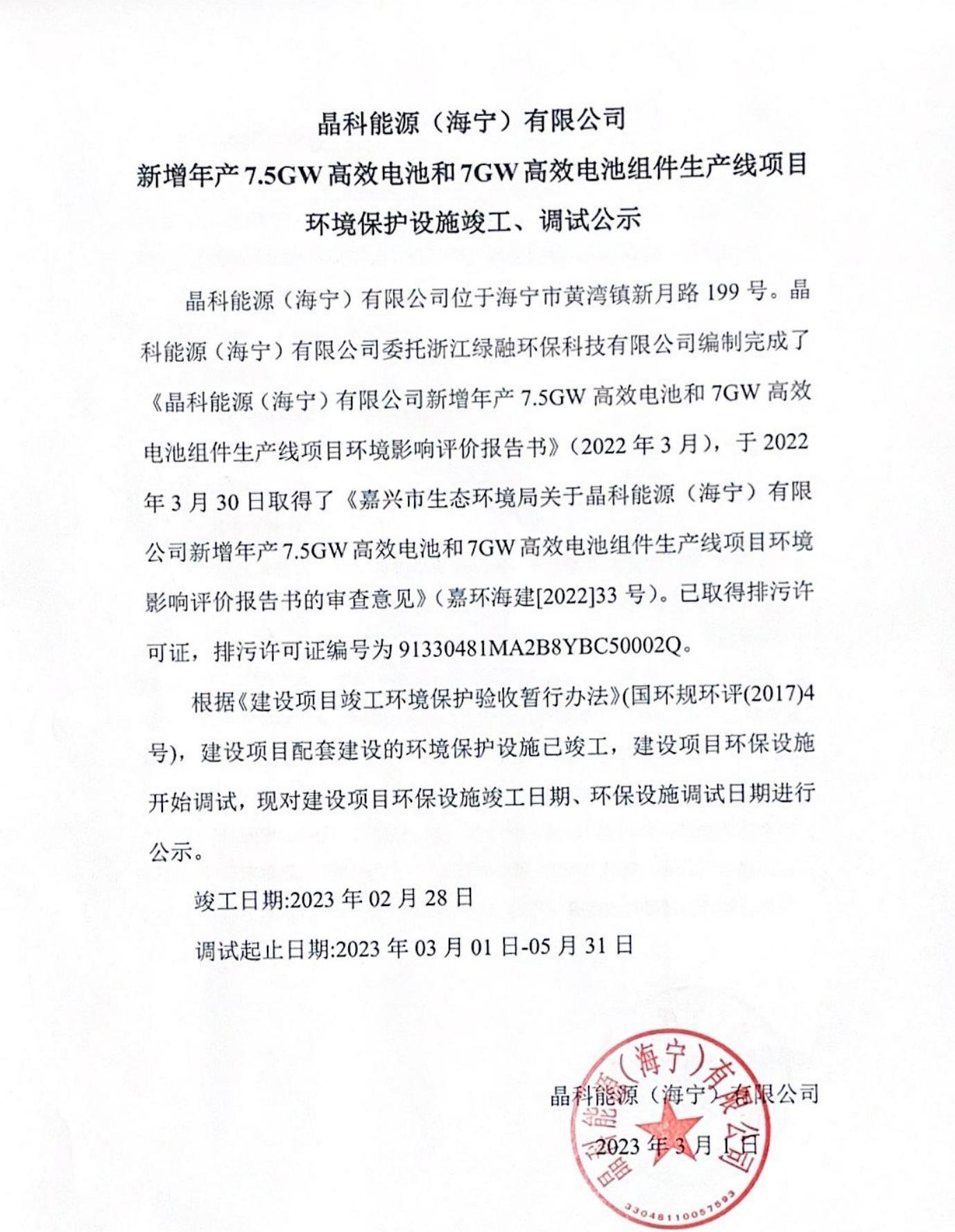 晶科能源(海寧)有限公司新增年產(chǎn)7.5GW高效電池和7GW高效電池組件生產(chǎn)線項目環(huán)保設施竣工、調(diào)試公示